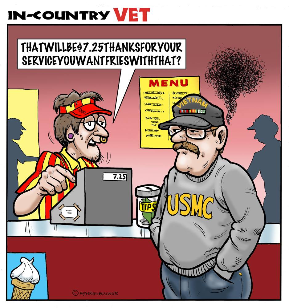 Phil enlisted in the Army in 1965 where you served for years in Vietnam.  He became a graphic designer and has worked for the state of Oregon for 26 years.  He retired in 2003 and started the Cartoon "In-Country".  The cartoons reflect his experiences during his tour of duty in South Vietnam.