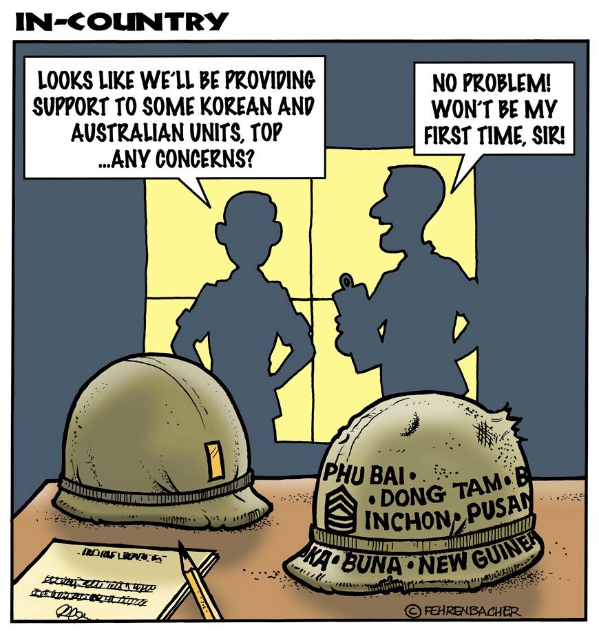 Phil enlisted in the Army in 1965 where he served for years in Vietnam. He became a graphic designer and has worked for the state of Oregon for 26 years. He retired in 2003 and started the Cartoon "In-Country". The cartoons reflect his experiences during his tour of duty in South Vietnam.